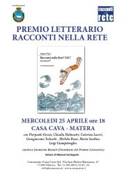 Categoria: Comunicato Stampa, In evidenzaIl premio arriva in Basilicata. Mercoledì 25 aprile alle 18 appuntamento con il premio letterario Racconti nella Rete presso il centro culturale Casa Cava di Matera, Via S. Pietro Barisano, 47. Incontro con i vincitori della XVI edizione del premio letterario Racconti nella Rete. Intervengono gli autori: Claudia Dalmastri, Pierpaolo Grezzi, Caterina Luceri, Giangiacomo Tedeschi, Luigi Giampetraglia, Michela Rossi, Maria Sordino.