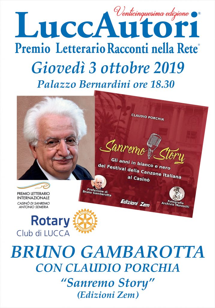 Giovedi 3 ottobre alle 18.30 presso la sala conferenze di Palazzo Bernardini a Lucca, BRUNO GAMBAROTTA con CLAUDIO PORCHIA presentano “SANREMO STORY GLI ANNI IN BIANCO E NERO DEL FESTIVAL DELLA CANZONE ITALIANA AL CASINO’ ” (Edizioni Zem).