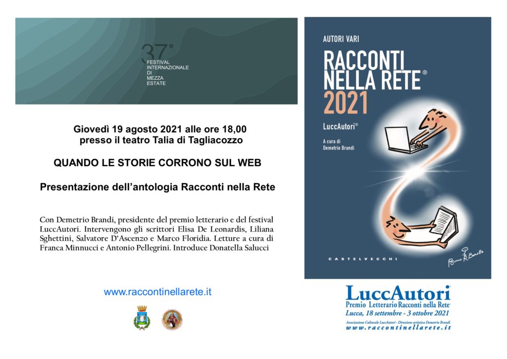 Nel pomeriggio, alle 18, al teatro Talia l’incontro con alcuni vincitori del Premio letterario Racconti nella Rete. Con Demetrio Brandi, presidente di LuccAutori e del premio letterario, intervengono gli scrittori Elisa De Leonardis, Liliana Sghettini, Salvatore D’Ascenzo e Marco Floridia. Letture a cura di Franca Minnucci e Antonio Pellegrini. Introduce Donatella Salucci, vicepresidente del Comitato Dantedì CSMI – Tagliacozzo, e membro della giuria del premio letterario. Nell’occasione saranno ricordate le prime venti edizioni del premio. Il Premio letterario “Racconti nella Rete” viene considerato il più grande premio nazionale per inediti online.